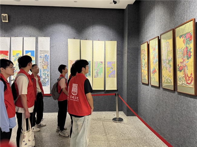 实践首日,团队怀着敬畏之心踏入凤阳凤画博物馆。在传承人的细致讲解中,学子们了解到凤阳凤画始于元末明初,以画凤凰为主体,融工笔重彩的华美与民间艺术的质朴于一身,构图严谨、色彩绚丽,承载着深厚的地方文化记忆与民间吉祥寓意。